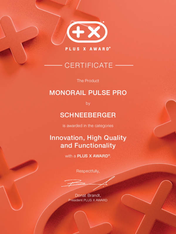 The MONORAIL PULSE PRO from SCHNEEBERGER has been honored with the PLUS X AWARD in the categories of innovation, functionality, and high quality.